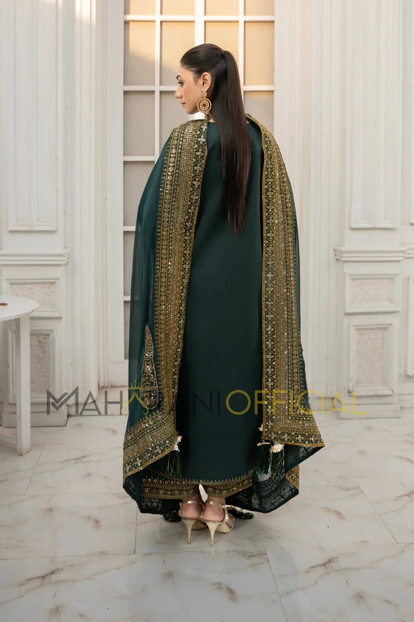 Green Mystique is a masterpiece of timeless design, featuring a full-sleeves long shirt adorned with intricate golden embroidery along the hem and neckline, creating a stunning contrast against the rich green fabric. The straight trousers are tailored to perfection, with delicate embellishments that harmonize beautifully with the ensemble, making \green Mystique an embodiment of elegance and allure.