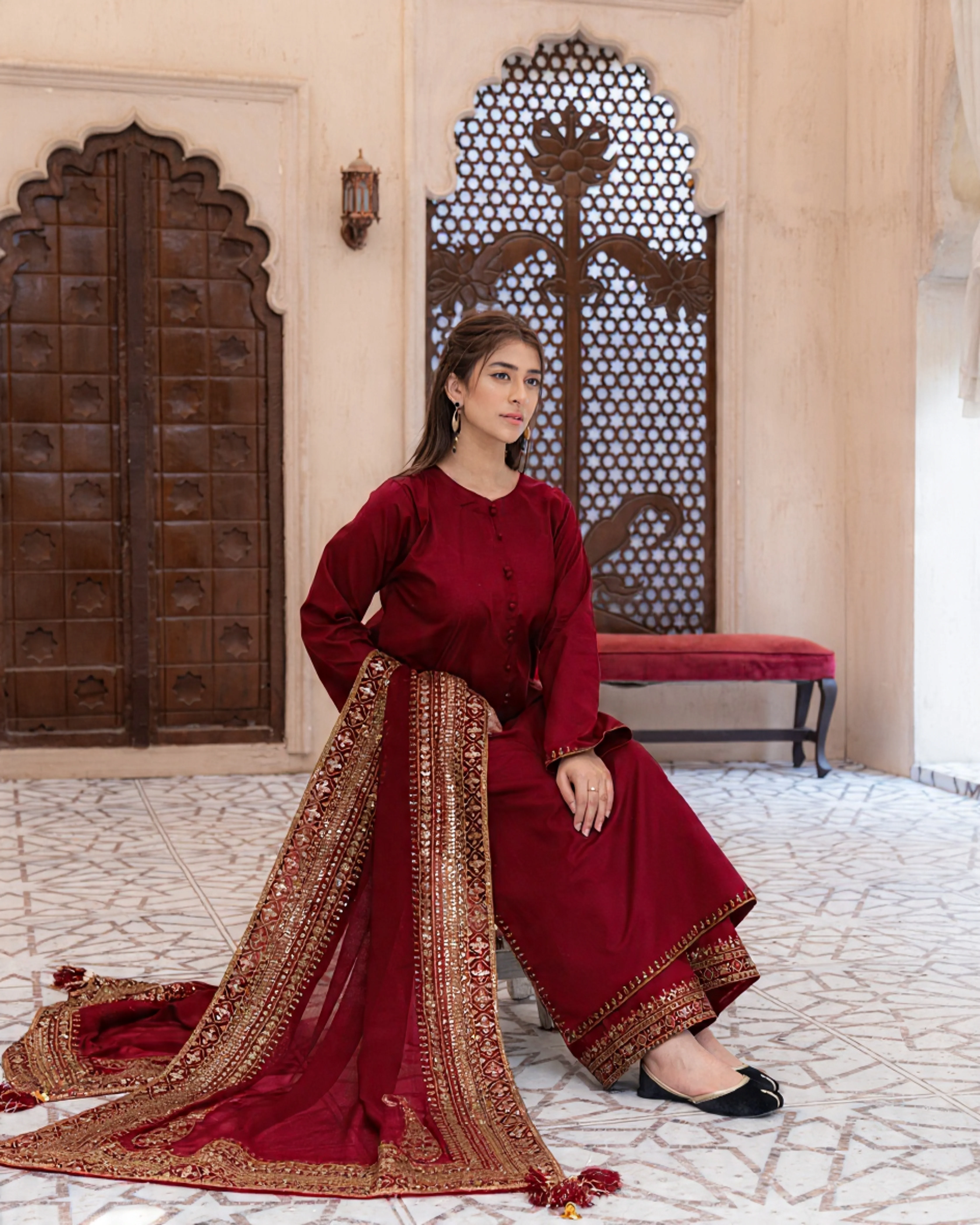 Introducing Mahroon Mystique, a timeless 3-piece stitched suit that brings together elegance, rich tradition, and fine craftsmanship. Designed in a deep mahroon shade, this ensemble is for the woman who values heritage while embracing a graceful, modern presence. The bold yet classic color symbolizes power, warmth, and mystery—perfect for the festive season.