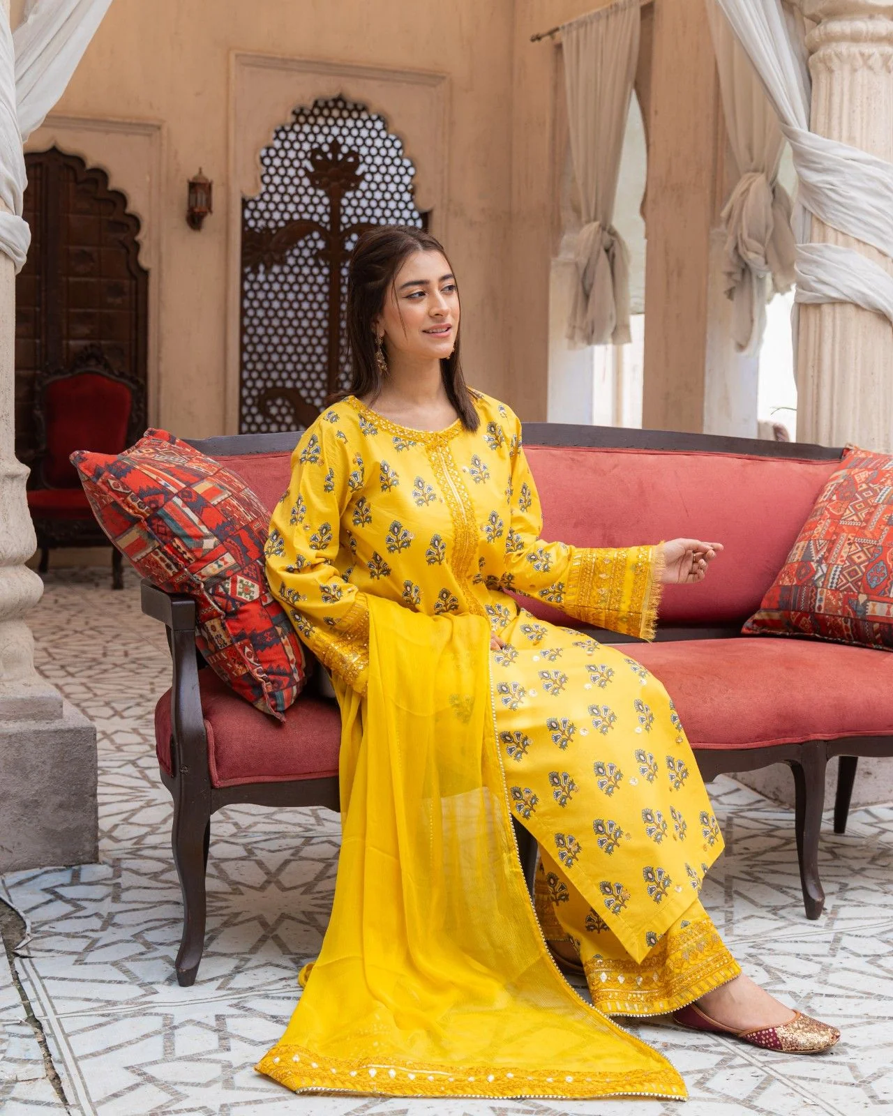 Crafted in a soft yellow hue, Marigold Flora captures the essence of joyful elegance. The shirt and trousers are made from premium printed Lawn fabric, celebrated for its lightweight feel, breathability, and smooth drape. The delicate floral prints are brought to life with exquisite sequins embroidery placed thoughtfully on the shirt, sleeves, neckline, and trouser—adding subtle sparkle and sophistication without overwhelming the design.