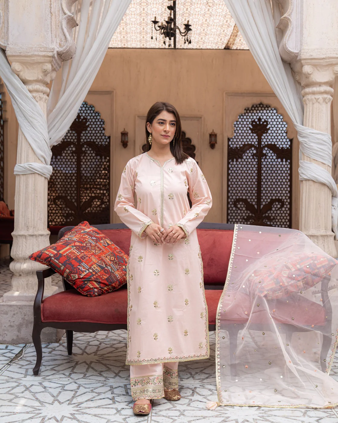 Step into elegance with Pink Mist, a breathtaking three-piece stitched suit designed for the modern woman who values timeless grace and feminine charm. This ensemble is presented in a delicate powder pink hue that radiates softness, warmth, and refined beautymaking it an ideal choice for festive occasions and daytime events.
