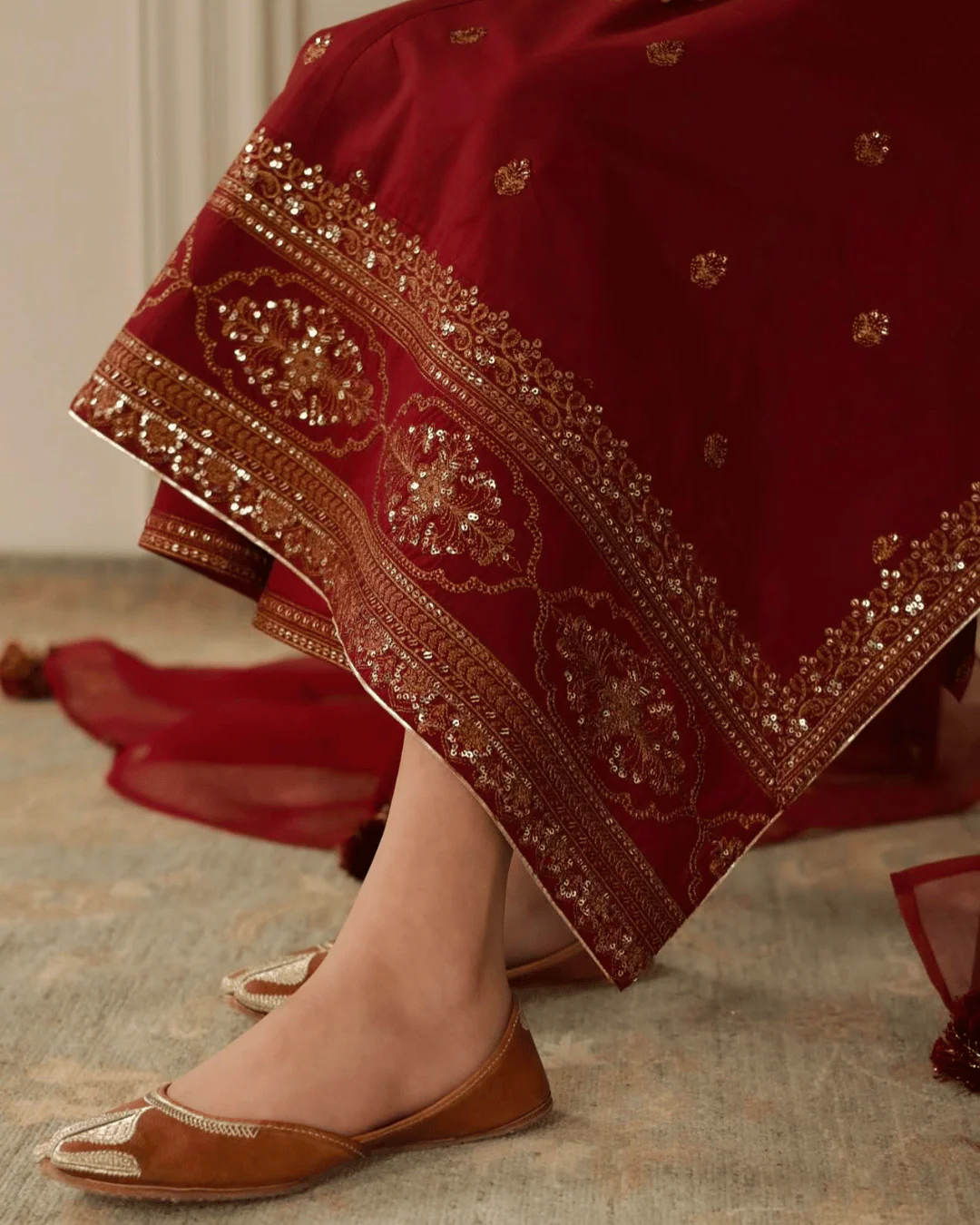 The flowing organza dupatta is adorned with delicate embroidery and embellishments, creating a regal charm that enhances the overall grandeur of this outfit. The rich maroon-red hue symbolizes strength and elegance, making it a perfect choice for festive occasions, weddings, or evening gatherings.