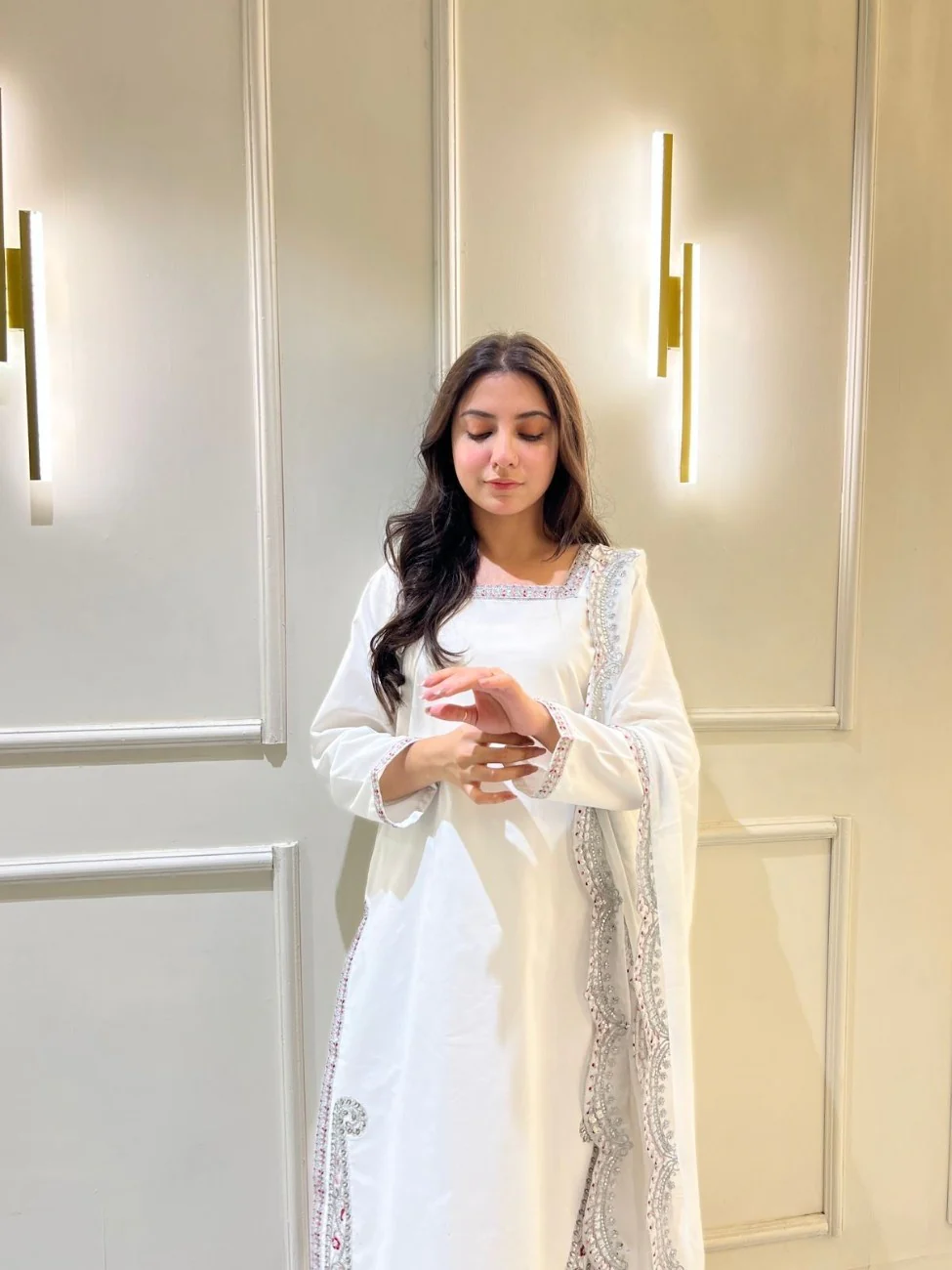 Whether you’re searching for a white Pakistani suit, Indian ethnic wear, or a simple yet elegant party outfit, this embroidered design is a timeless addition to your wardrobe. Combining the purity of white with the richness of handcrafted embroidery, it offers a classic look that never goes out of style.